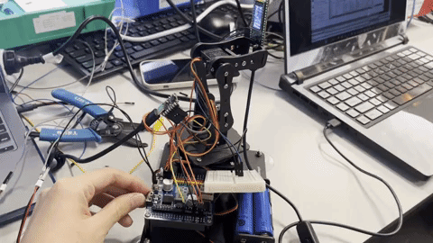 As I mentioned before, the camera module can only read gray value. If it is exposured to an environment with high light level, it will read every bright things and even things which are able to reflect light as white (grey value = 255), instead of reading the brightest led as white due to its low brightness threshold. This is an important issue as if we cannot solve it, this robotic arm can only operate properly in relatively dark environment. This is a big limitation to the demo of our project!!! And if the image processing doesn’t well, it sends wrong control message to RP2040 and leads to a mess like this: